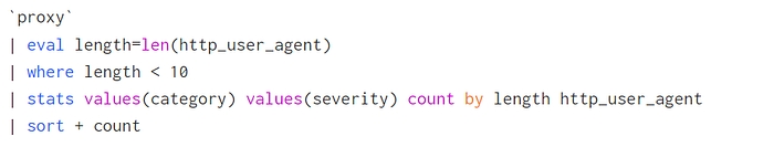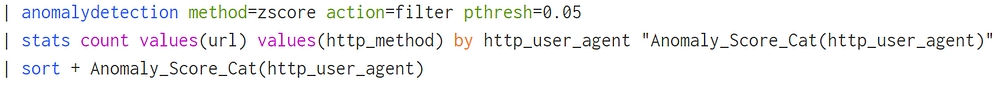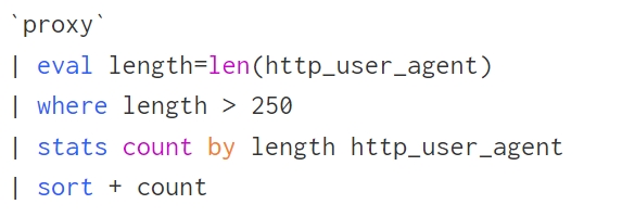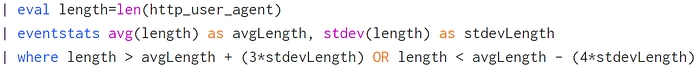 eval length=len(http_user_agent)— length per eventeventstats avg(length) as avgLength, stdev(length) as stdevLengthFilter where length > avgLength + 3stdevLength OR length < avgLength − 4stdevLength