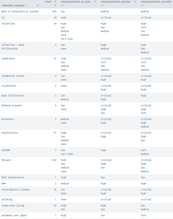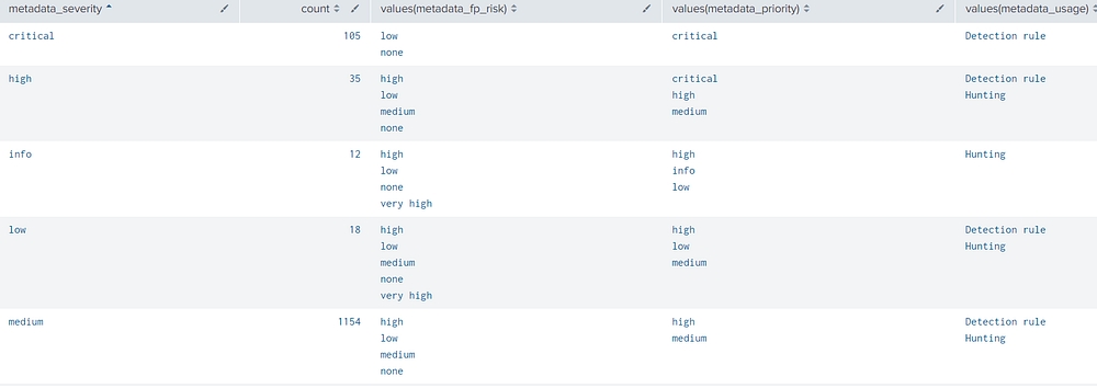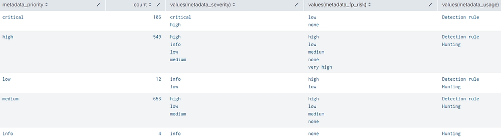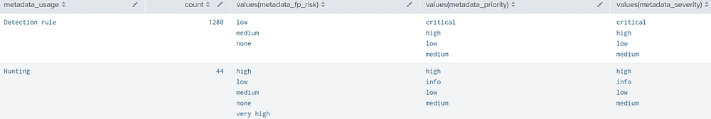 metadata_usage: recommended usage based on priority/fp/severity — either “Detection rule” (high-confidence rules) or “Hunting” (investigative only)