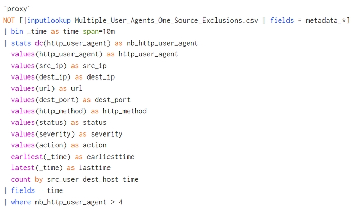 Example: more than 4 distinct User-Agents to the same domain (dest_host) in 10 minutes.